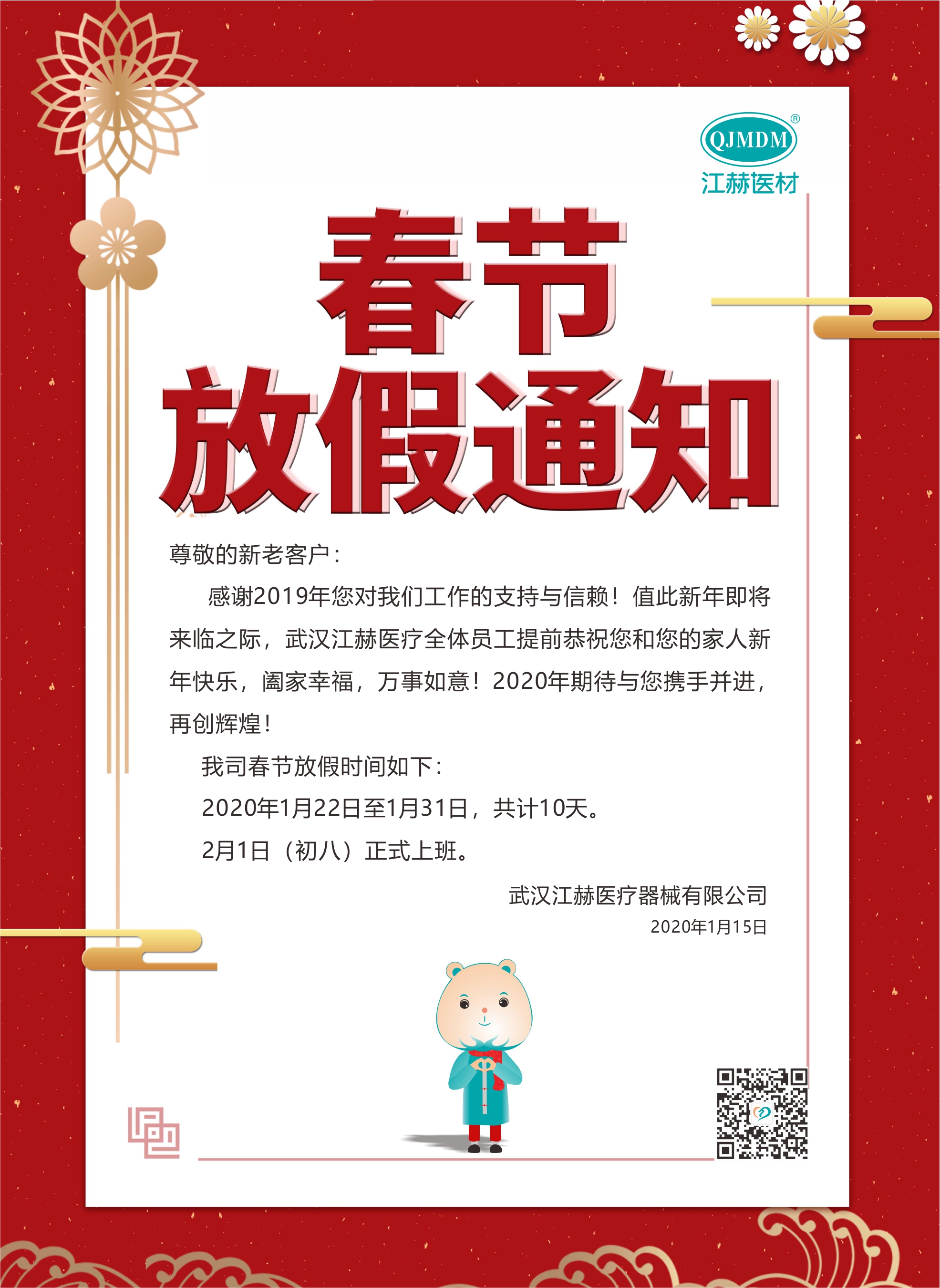 武漢江赫醫療器械有限公司于1月22日-1月31日放假