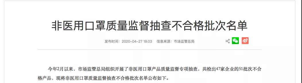 國家市場監管總局曝光,51批次口罩被查不合格,涉及47家企業......