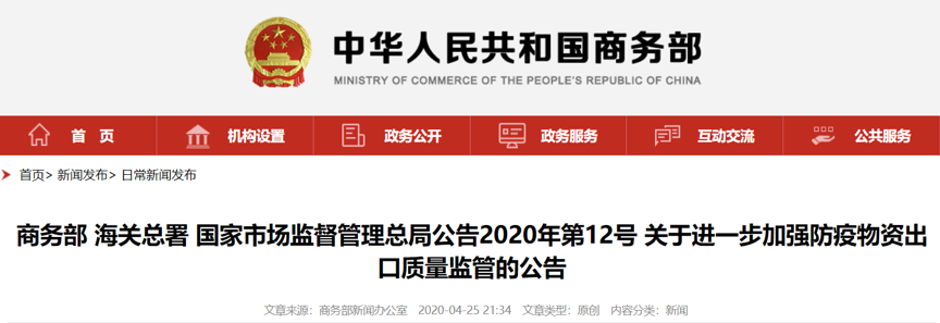 繼今年3月31日商務部、海關總署、國家藥監局聯合發布5號公告后,三部門日前再發12號公告,強調自4月26日起,嚴格對非醫用口罩的出口質量監管。